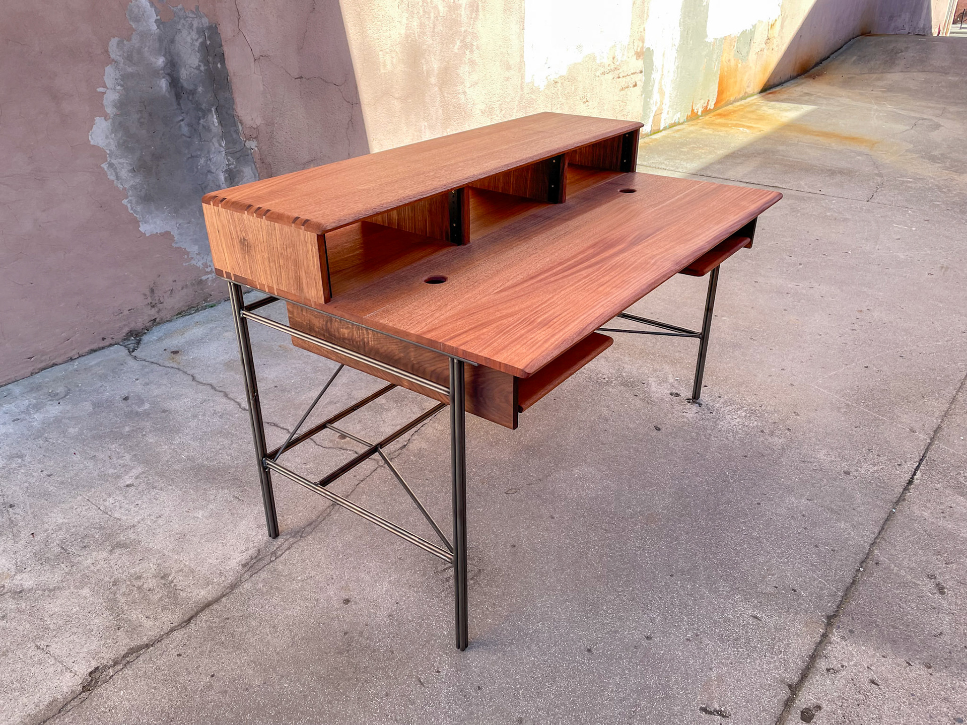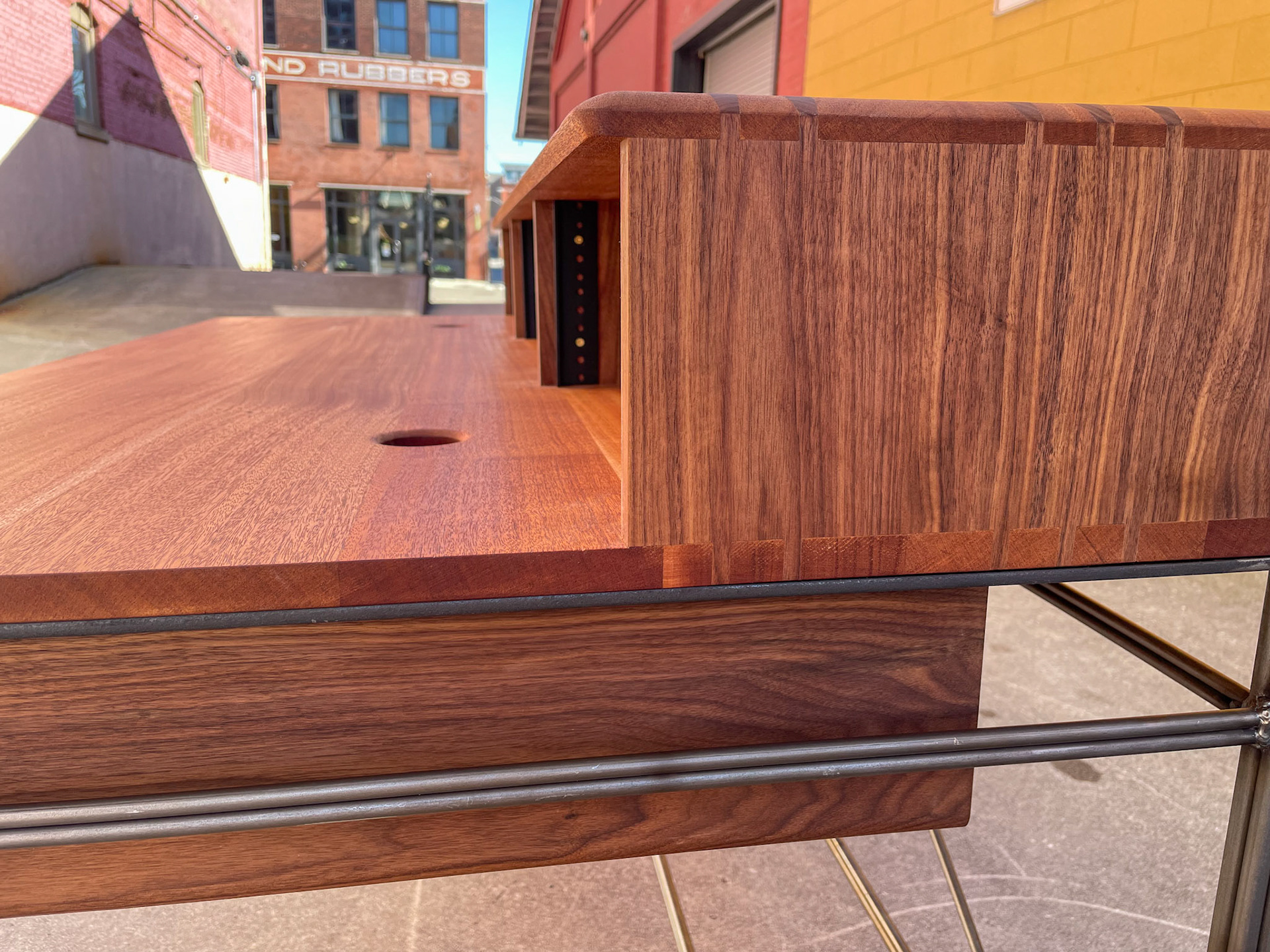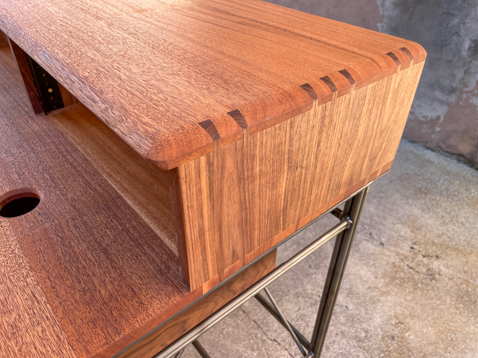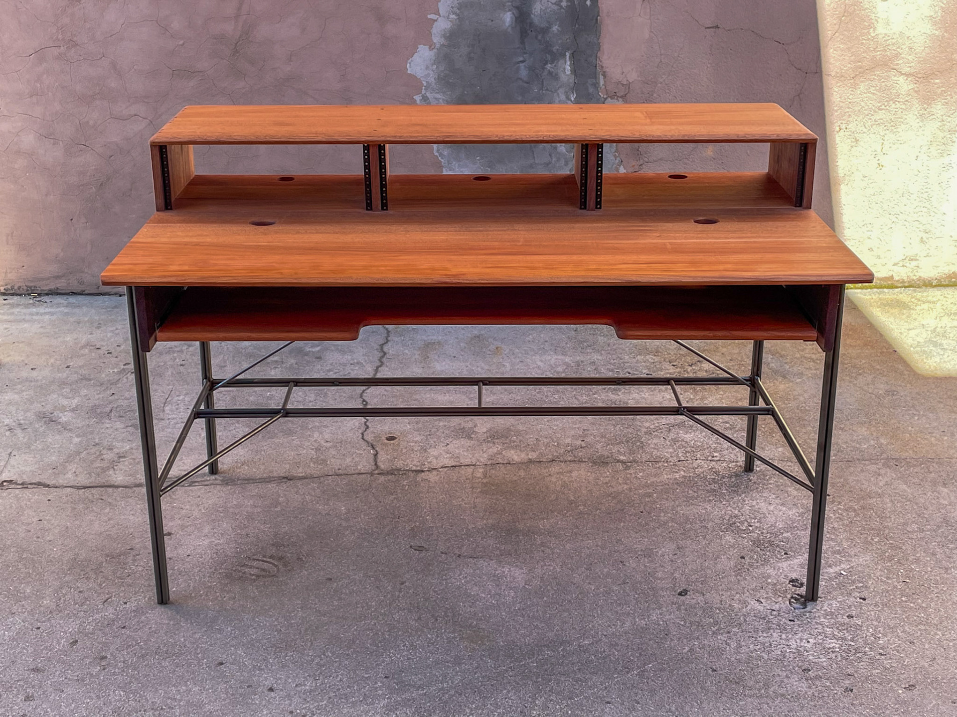 Mahogany music production table with sliding shelf. Rounded dovetails, cable routing, and standard rack mounts. Metal base by Grace Gish.