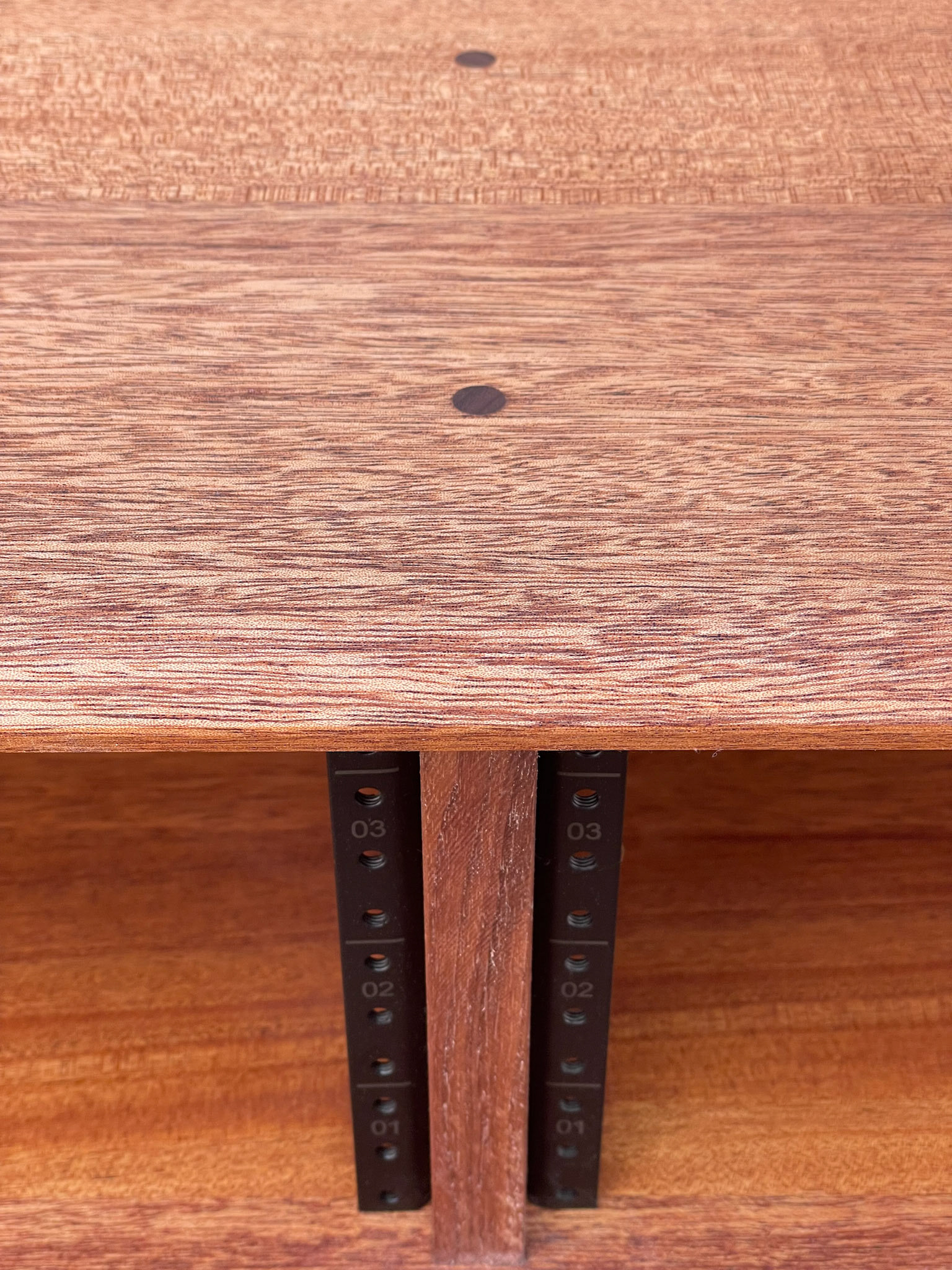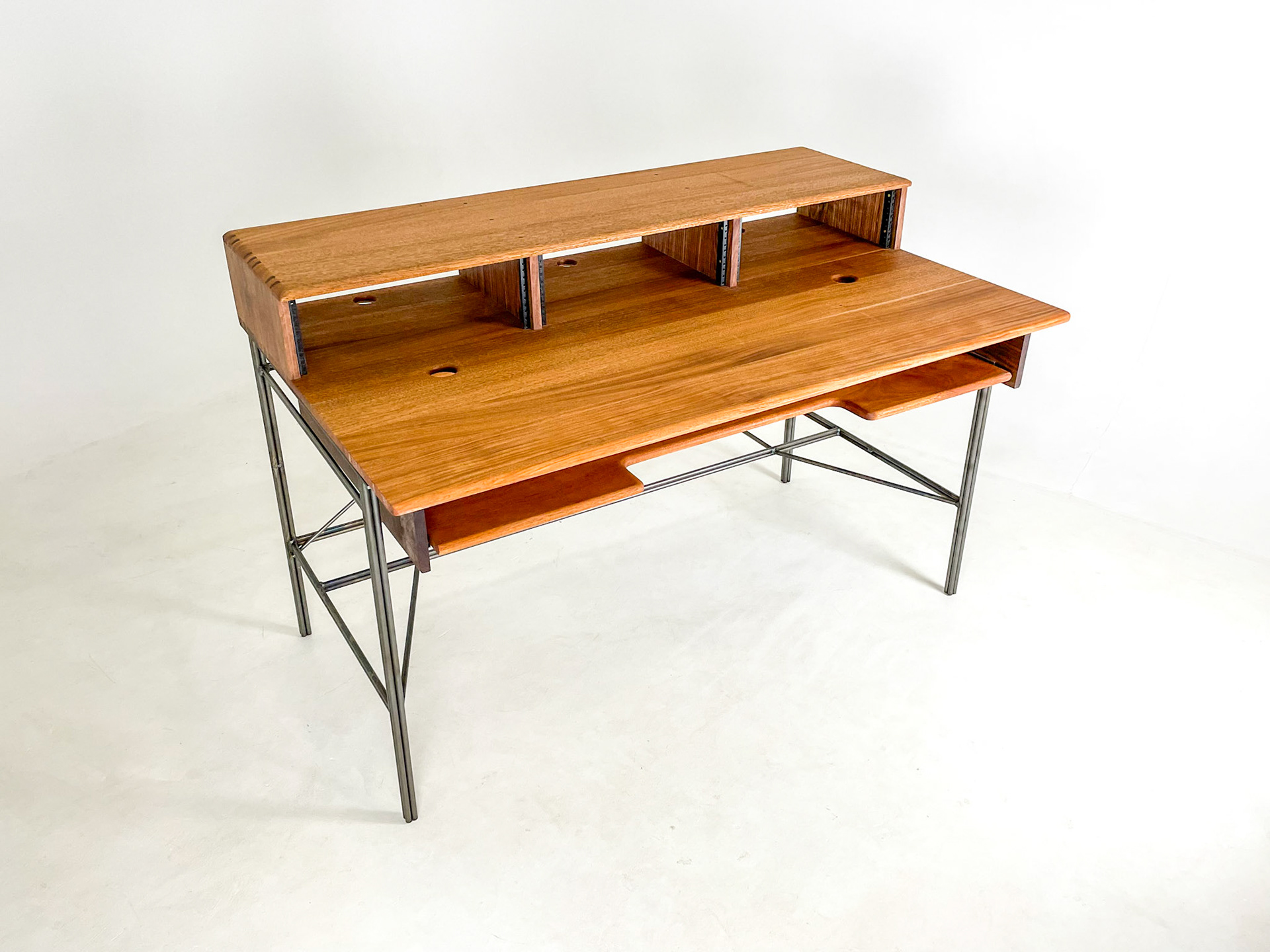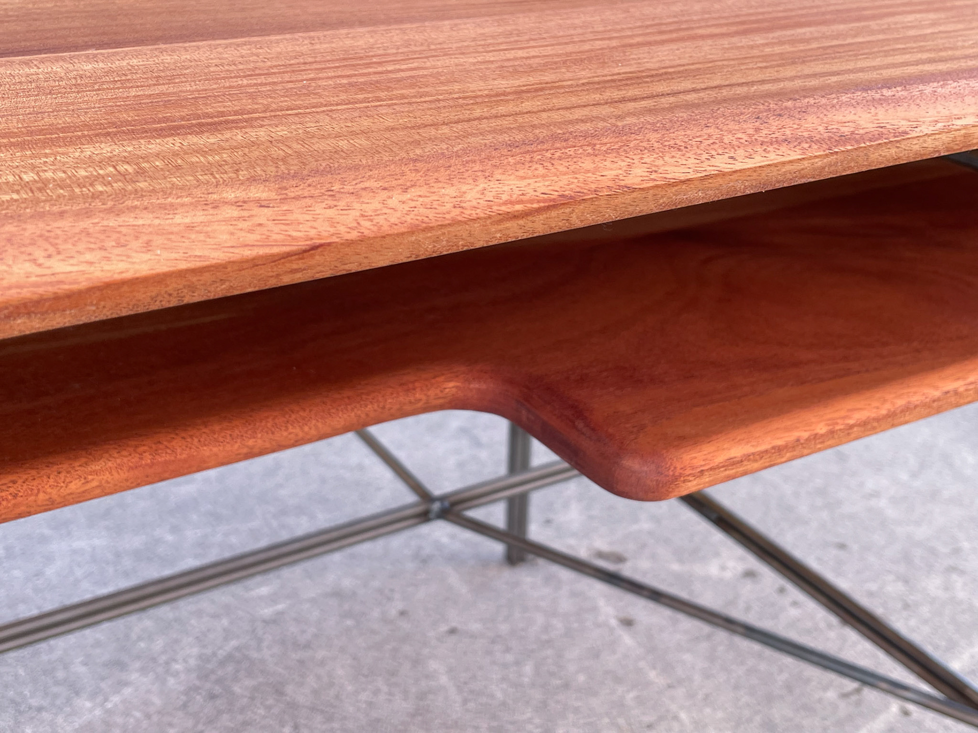 Mahogany music production table with sliding shelf. Rounded dovetails, cable routing, and standard rack mounts. Metal base by Grace Gish.