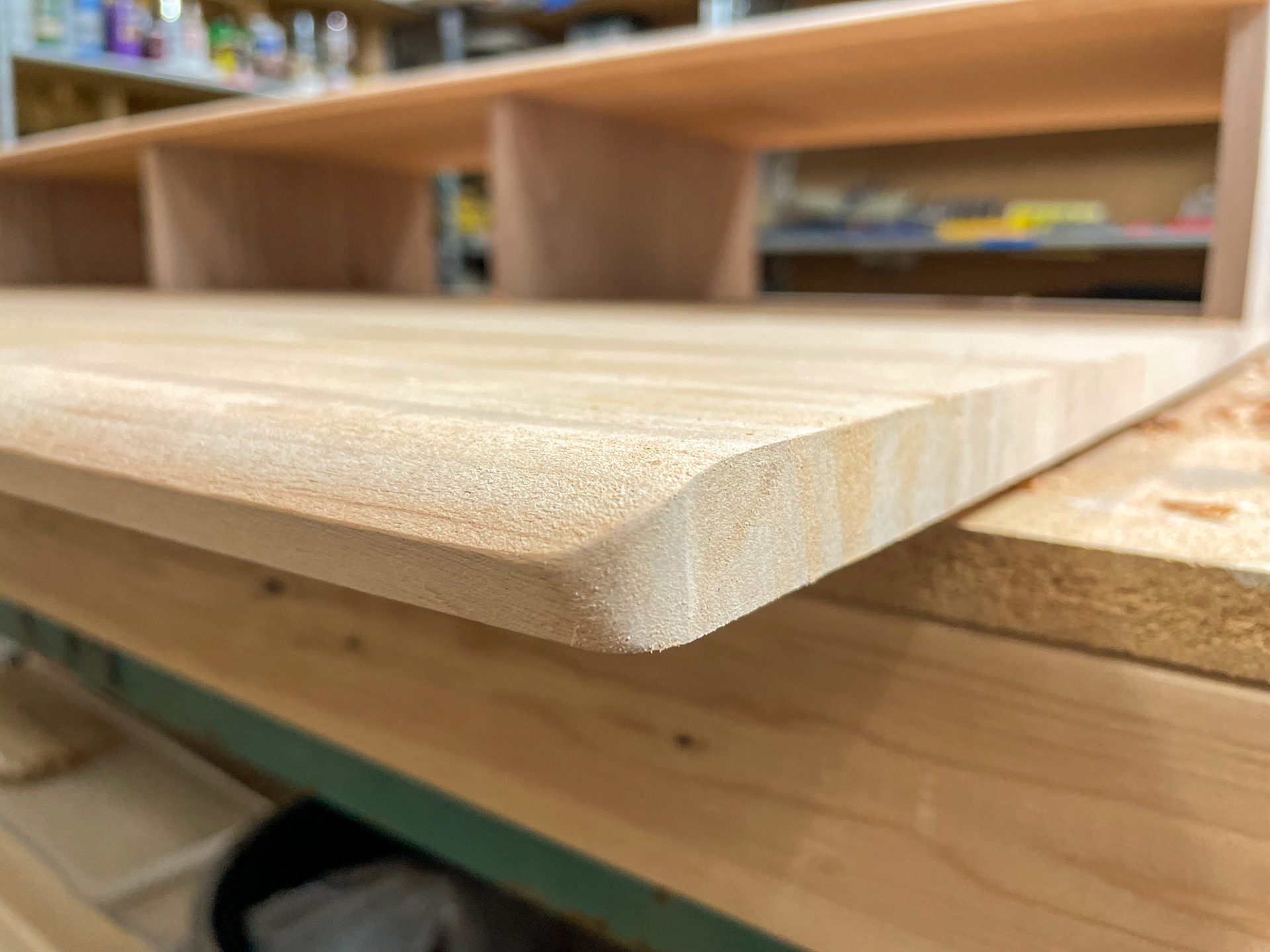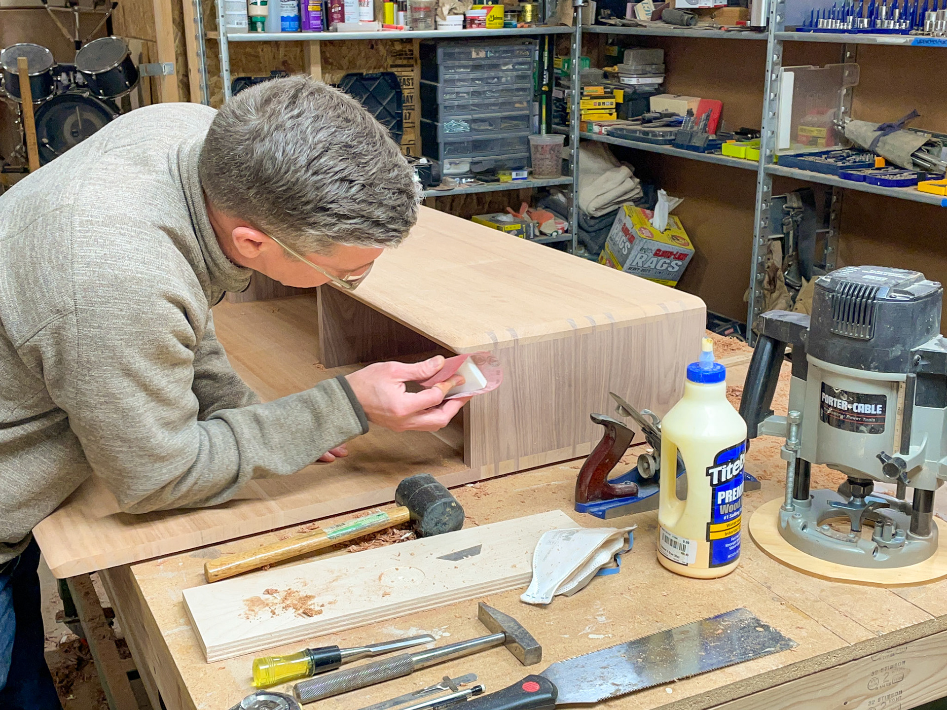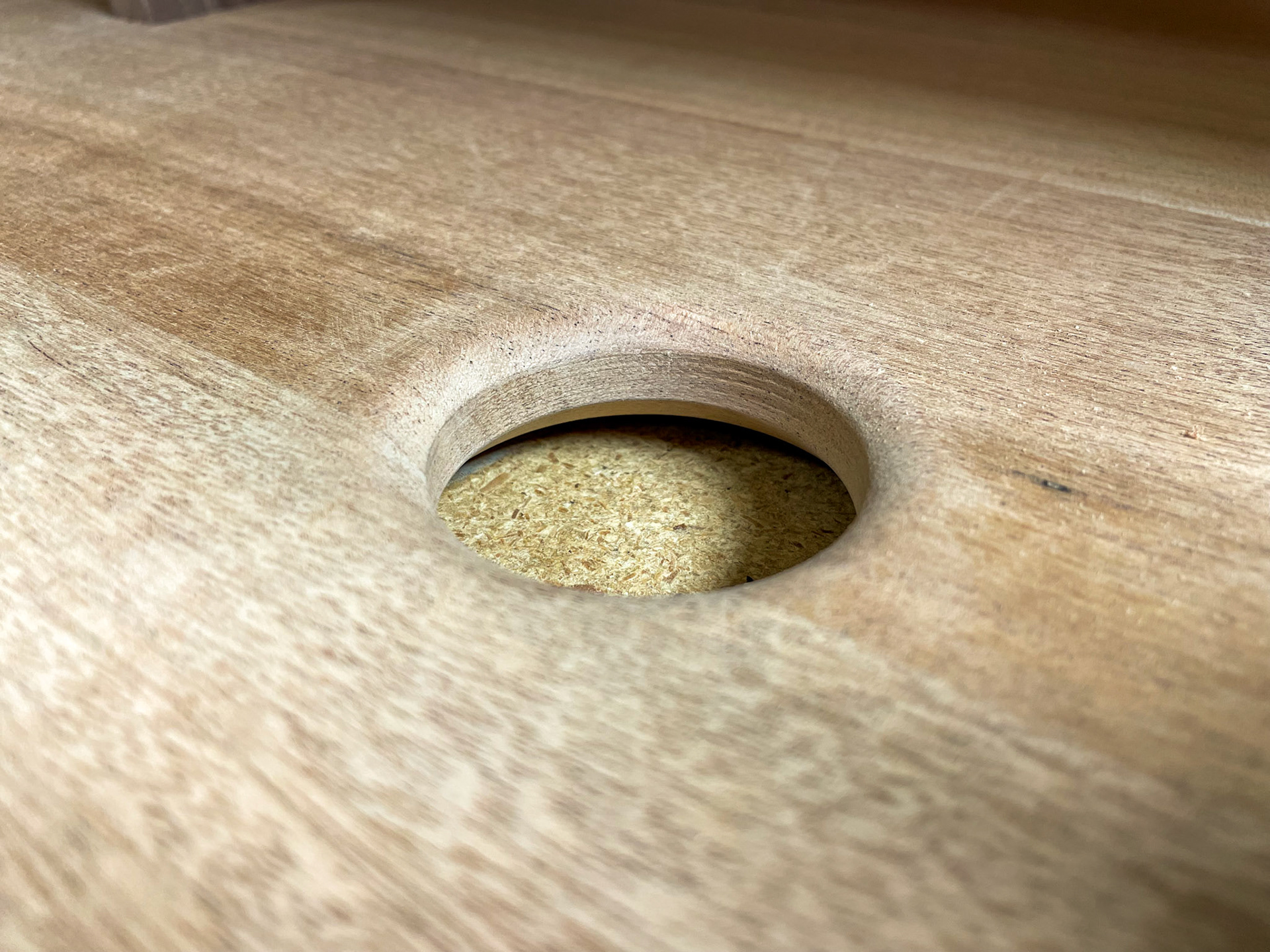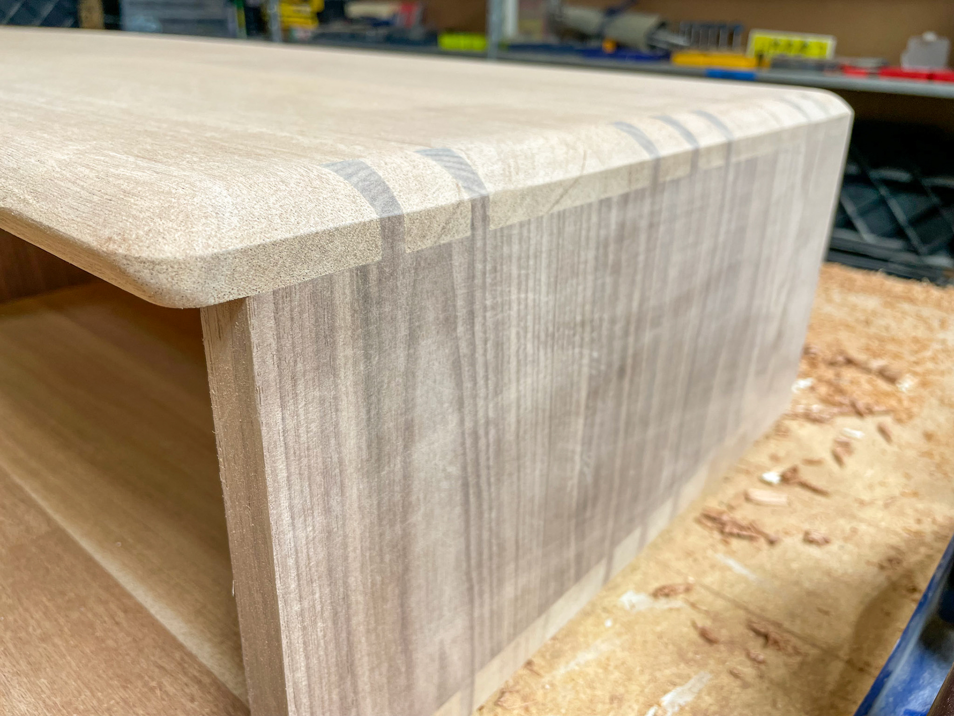 Mahogany music production table with sliding shelf. Rounded dovetails, cable routing, and standard rack mounts. Metal base by Grace Gish.
